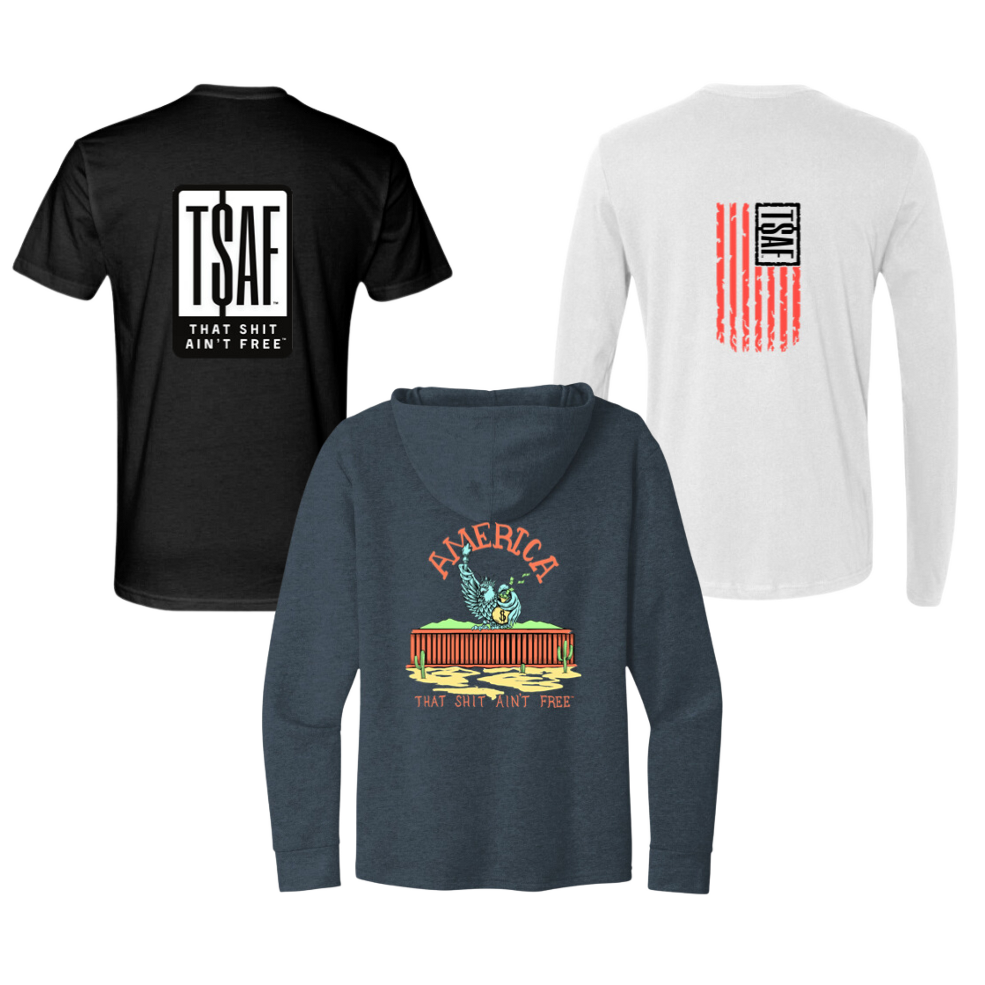 ITEM #2. Our simple T$AF red and blue flag adorn the back of this t-shirt with our black and white logo over left chest.